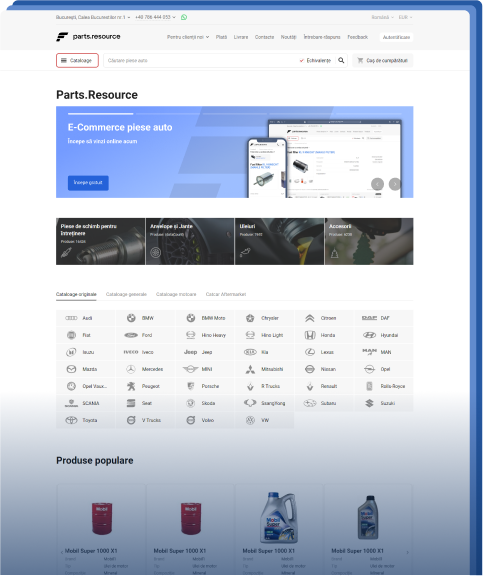 Crearea unui magazin online de piese auto cu un set de funcționalitati bine gândite este o sarcină, care se rezolvă cu ajutorul platformei Parts.Resource. Se ia pe deplin în considerare specificul și particularitățiile afacerii de comercializare piese de schimb auto și are instalat tot ceea ce este necesar pentru un magazin online de piese auto, complet funcțional: căutarea unei piese de schimb printre piese analoage și înlocuire, solicitari VIN, cataloage auto, conexiuni online la site-uri furnizori. Să achiziționați Parts.Resource înseamnă să asigurați creșterea și dezvoltarea companiei dvs.